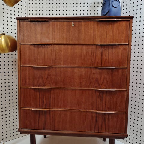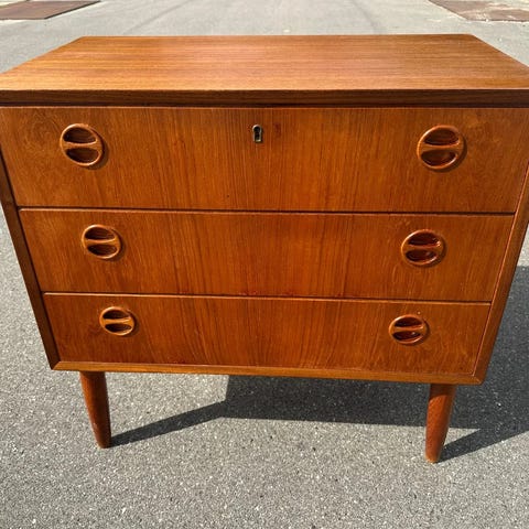 Superflot kommode i teaktræ med 4 skuffer. Meget velholdt og helt intakt, bortset fra en lille flig der mangler på det øverste greb (se billede) . Den øverste skuffe kan låses og nøgle medfølger. Skufferne er hvide indvendigt.
