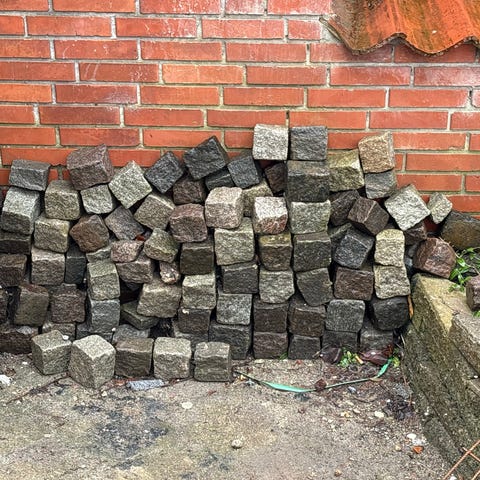 Belægningssten, Flere forskellige størrelser af brosten, chaussesten og granitblokke, fra 5,- kr og opefter, kom og kig