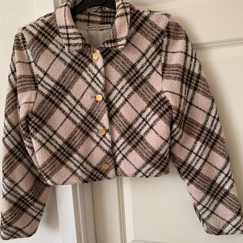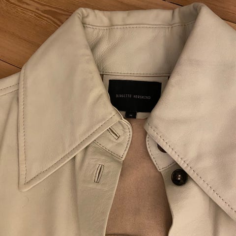 Birgitte Herskind sort overgangsjakke med lommer på brystet og i siden. Meget fnulret i stoffet nogen steder, der kan fjernes. Købt med et hul i siden, som er syet sammen. Størrelse 38. 52% polyester, 48% uld. Style: Amber jacket. Slidt. Nypris: 1.999kr
