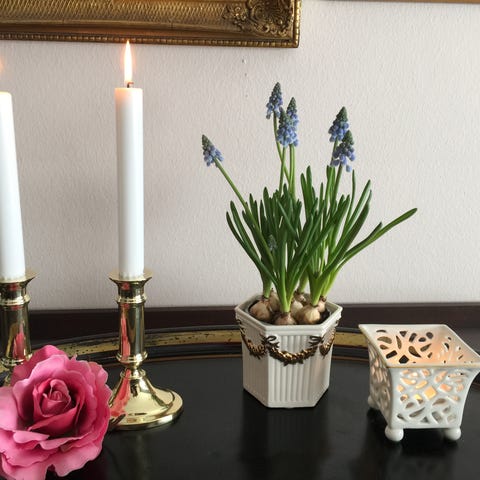 Der er to blå og to brune lysestager, der både kan bruges til alm. lys og til fyrfadslys. 5 kr. pr. stk.