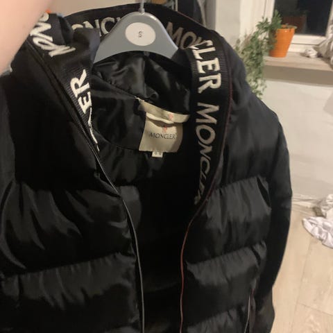 Jakke, str. S, Moncler, Sort, God men brugt, Moncler jakke str. small. Jakken sælges da jeg er vokset ud af den. Jakkens ærmer er lidt slidte, se billeder samt har der været en skade ved lommen, som er fikset. Derfor prisen.