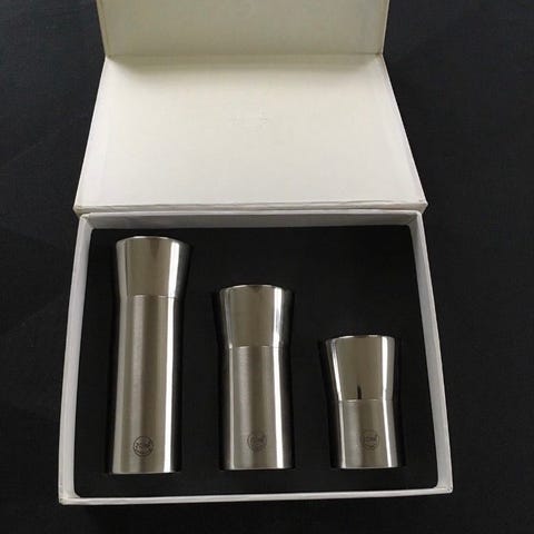 Røgfarvet glas og rustfri stål.