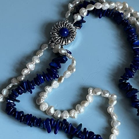 Kæden er trukket på kraftig beigefarvet perlesilke og der er håndbundne knuder mellem perlerne.