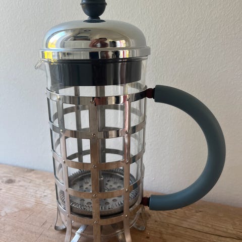 Stempelkande, Alessi, Sjælden stempelkande fra Alessi til seks kopper kaffe. Modellen hedder Inka Cafetiere, designet af italienske Guido Venturini. Udgået. Plastiklåget mangler et stykke omkring hullet - se billede. Ellers i rigtig fin stand. Jeg har før kunnet bestille løsdele fra Alessi hos en velassorteret isenkræmmer, der forhandlede mærket.