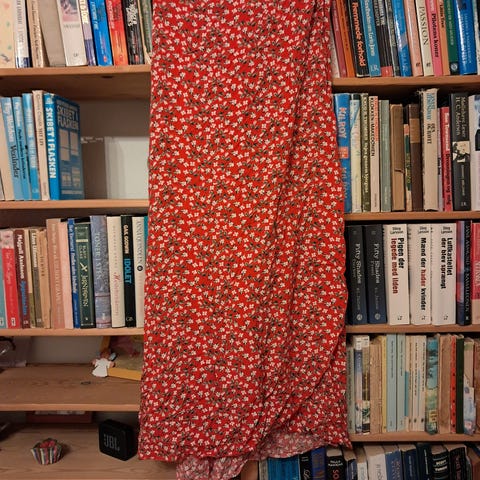 Slå om nederdel, str. One size, Ukendt, Rød, Thai silke , Ubrugt, Dejlig rød slå om nederdel med mønster i guld i 100% thaisilke. Nederdelen måler længde 96 cm og øverste fulde bedde er 124 cm.