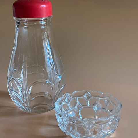 Glas, Sukkerstrødåse, Gammel tranebærfarvet 12 kantet sukker strødåse. Højde 15 cm.