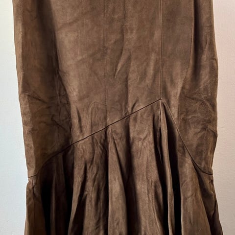 Skindkjole, Ralph Lauren, str. M, Mørk camel, Ruskind, God men brugt, Skøn slank kjole i det fineste ruskind med stolpelukning i front og flæse ved udskæring i front. Den kan anvendes med og uden bluse under, og kan anvendes som lang vest. Fremstår i god stand, ingen pletter eller misfarvninger. 55kr med gls ( fragt).