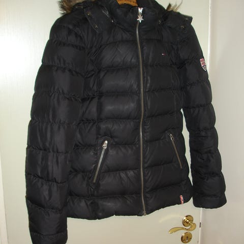 Vinterjakke, str. 36, Hilfinger, Blå, Dun, God men brugt, Lænker dun jakke fra Hilfinger. Str M. Med aftagelig hætte. Sidder super flot. Dejlig varm. Har et lille hul på ryggen og lidt slid ved ærmet, se billeder. Men ellers rigtig fin. Nypris 1700kr. Fra ikke ryger.