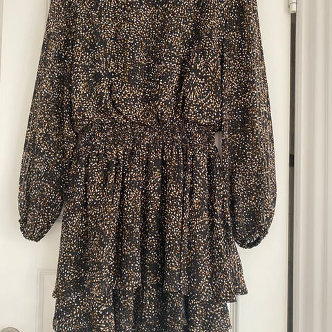 Smuk og elegant ærmeløs kjole med fine flæser. Let chiffonagtig stof med en fastsyet underkjole i nederste del, så kjolen ikke er gennemsigtig. Der er knapper hele vejen gennem foran. Farven er mørkeblå, den præcise nuance kommer ikke helt frem på billederne. Som ny