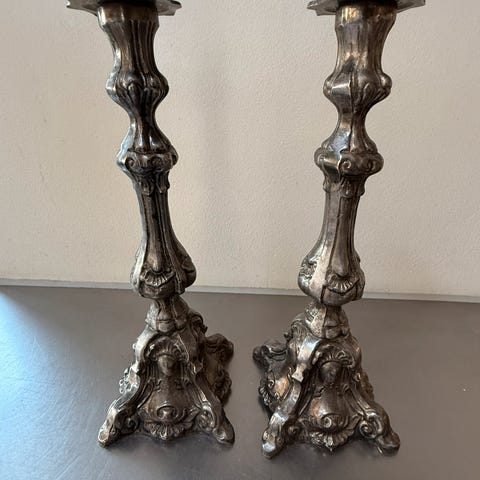 Ca 35 cm høje med rigelig patina prisen er sat der, giv dem en gang spraymaling så har du to unikke stager
