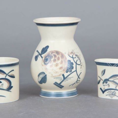Smuk lille vase med fugl eller nok oprindelig et cigaretbæger nr. 10 26 mat porcelæn - blød porcelæn - benporcelæn. Højde 6 cm - bredde 7 cm. Design - samarbejde mellem Nils Thorsson og Olaf Mathiesen, 1927- 32. Først produceret hos Aluminia, men da Royal Copenhagen købte Aluminia fortsatte produktionen her.