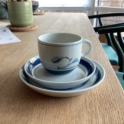 Sæt med kagetallerkener, kop og underkop kr 65.