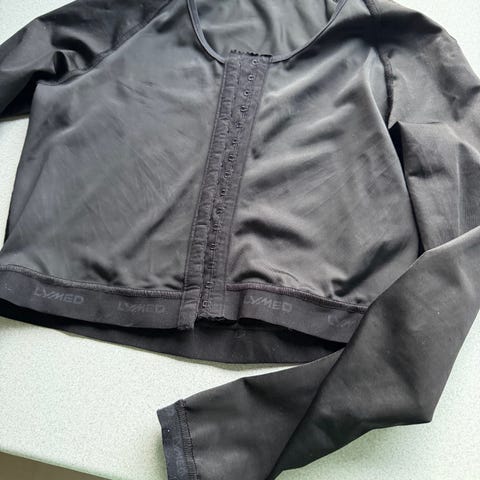Der står ingen str. / materiale i den, så se alle fotos. Måler rundt hvor den skal knappes og er smallest ca. 76 cm. Længde bagpå ca. ca. 39 cm.