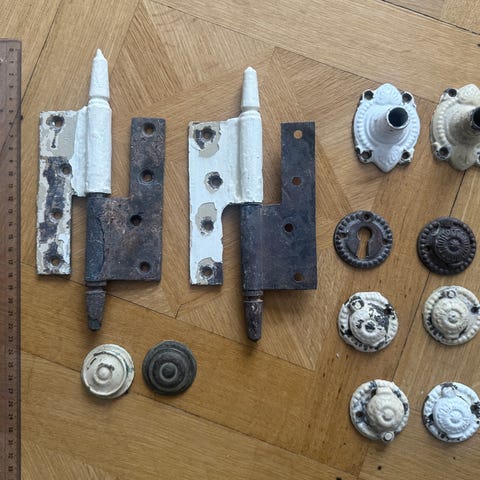 Antikke yderdørshængsler, 21 cm høje.