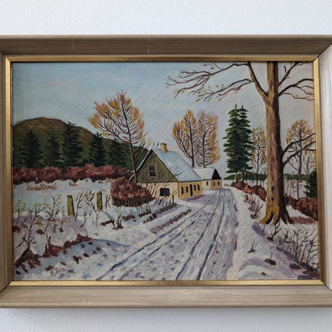 Oliemaleri, Andreas Friis , b: 57 h: 48, Fint oliemaleri af Andreas Friis. Signeret 1924. Malet på plade. Målene er inkl ramme.