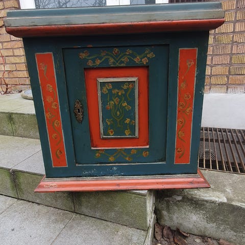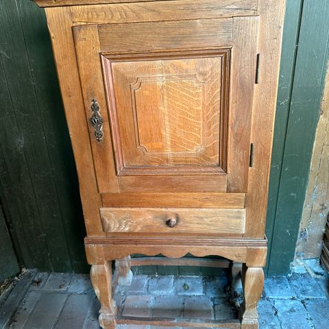 Vægskab, Barskab, tobaksskab, b: 60 d: 14 h: 60, Gammelt vægskab med blyindfattede farvede ruder.