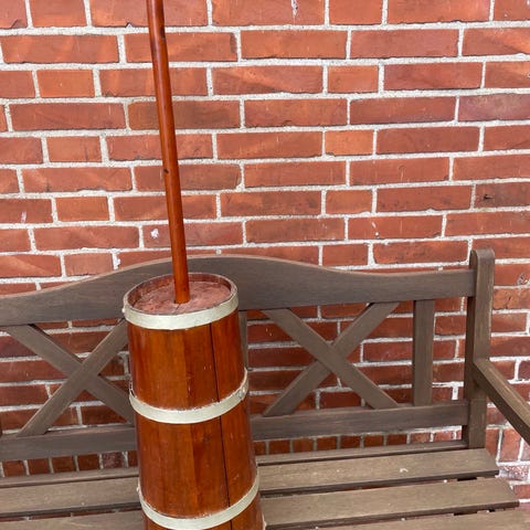 Smørkern, 100 år gl., b: 32 d: 32 h: 52, Gammel smukt dekoreret smør kern med broderet låg. Der er monteret praktiske små hjul under kernen. Jeg kender kke den præcise alder, men den er monimum 100 år gammel, da den har tilhørt mine tipoldeforældre i Sønderjylland.