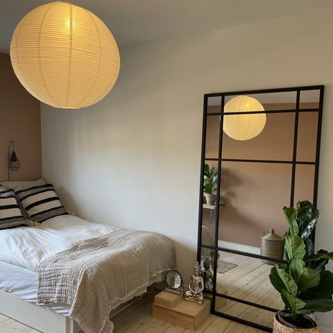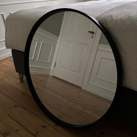 Stort, flot spejl med en sort jernramme i kvadratiske mønstre. Et dekorativt spejl til både entré, stue, soveværelse eller hvis du f.eks. har et walk-in-closet.