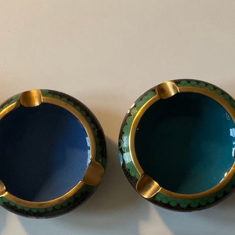 Smukt vintage Cloisonné askebæger i perfekt stand. Askebægeret har de klassiske elementer fra den kinesiske Cloisonné-teknik, hvor metaltråde danner rammer for de håndmalede blomster og mønstre. Dette giver en detaljeret og farverig overflade, der er både kunstnerisk og funktionel.