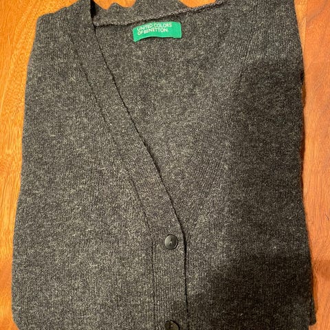 United Colors of Benetton armygrøn striktrøje med dyb v-hals, knapper og lommer foran. Størrelse S. 100% bomuld. Brugt få gange, næsten som ny.