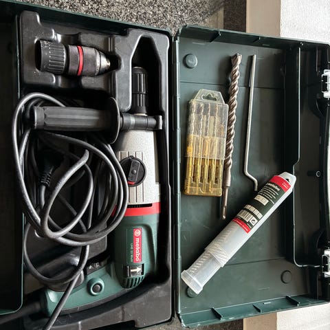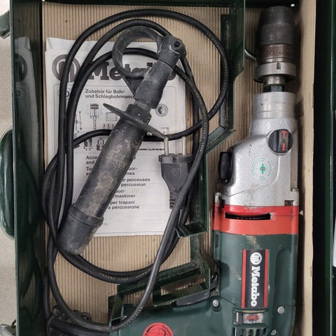 Boremaskine, Metabo, slagboremaskine med metalgearkasse, 2 gear, frem- og tilbage. Bemærk: man skal ikke fumle med et lille hjul på aftrækkeren for at hastighedsregulere, hastigheden reguleres med et stort hjul (7 hastighedsområder) på oversiden af maskinen samt trinløs, elektronisk regulering i aftrækkeren. Ved siden af hjulet findes kontrollampe med 3 funktioner: 1. Indikerer at strømsvigt er forbi (maskinen starter ikke, hvis strømmen har være væk), 2. slidte kul eller 3. overbelastning (ved overbelastning reduceres maskinens effekt automatisk for at undgå skade). Manualen indeholder vejledning om bedste omdrejningstal i forskellige materialer. Maskinen leveres med solid plastkasse.