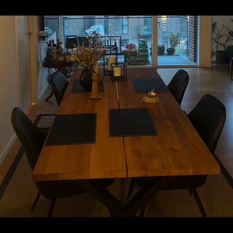 Spisebord u/stole, Planker, Plankebord4You, b: 97 l: 199, Smart plankebord med pejs fra Plankebord4You. Bordet er lavet på særbestilling og har speciallavede "hakker", der giver spisebordet et unikt look.