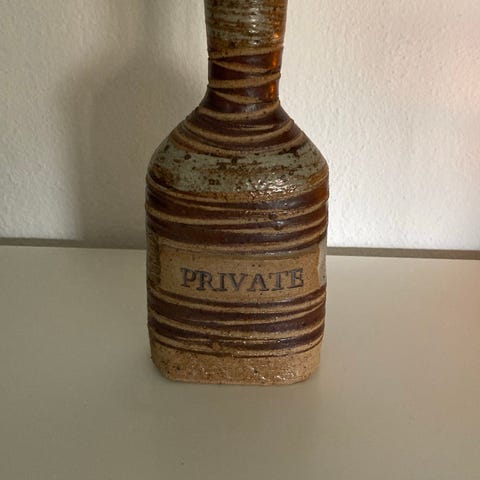 Keramik, dram flaske, Tue keramik, en ca 20 cm høj fejlfri keramik dram falske fra Tue Keramik med et stykke forpå hvor der står Privat , i brune farver og med kork prob . sendes for købers regning 43 kr eller hentes her