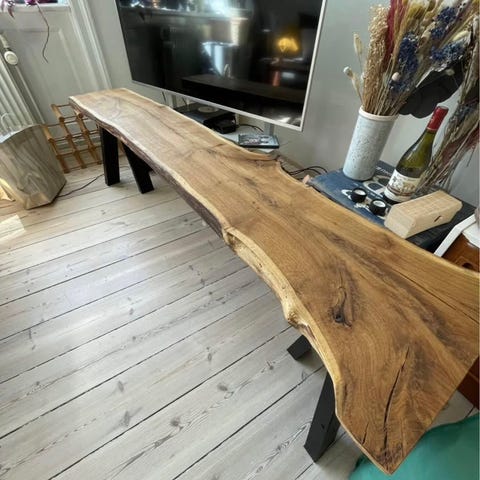 Bænk, Egetræsbænk med bark. En bænk i massiv egetræ. Helt unik og helt igennem robust. Der findes kun dette ene eksemplar. Vi har brugt den som bænk i vores entre, indendøre. Den står helt rå, brutal og organisk. Så elsker du den rustikke natur er her et smukt stykke unika design. Passer perfekt ind i naturtemaet.