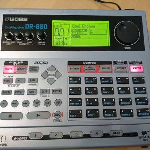 Groovebox, Boss DR-3 Dr. Rhythm, Funky lille trommemaskine med det unikke gimmick at den har indbygget sangstruktur og basgange. Manual medfølger.