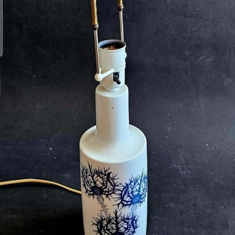 Flot mørkeblå bordlampe i glas, fremstillet hos Kastrup-Holmegaard for Fog og Mørup i 1966. Modellen hedder Brams 1 og er designet af Lisbeth Brams.