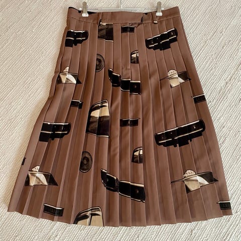 Tiger of Sweden sæt af nederdel og t-shirt. Nederdelen er faconsyet, meget højtaljet og har midi-længde i størrelse 34, style: Vari P. T-shirten har drapering på halsen/brystet og er i størrelse 34, style: Volona P. Mønster i lys beige/sand. T-shirten er brugt og vasket en gang, nederdelen har aldrig været brugt. 100% cupro.