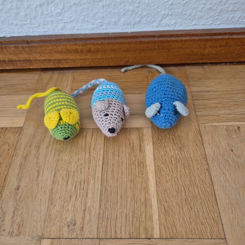 Hæklede mus, hjemmehæklet, Helt nyt, hjemmehæklet sæt bestående af to hæklede mus. Måler ca. 31 cm i højden (inkl. ører). Sælges som par. Hæklet i 100% bomuld og fyldt ud med fyldevat af 100% polyester.