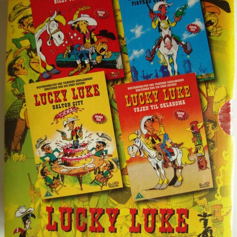 Lucky Luke Box, 5 film, DVD, familiefilm, Alle fem dvd er plomberede. Selve boxen er lidt slidt i hjørnerne. men fejler ellers ikke noget.