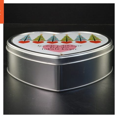 Dåsen er cylinderformet og hvidemaljeret indvendig og har engang indeholdt brunkager fra Karen Volf.
