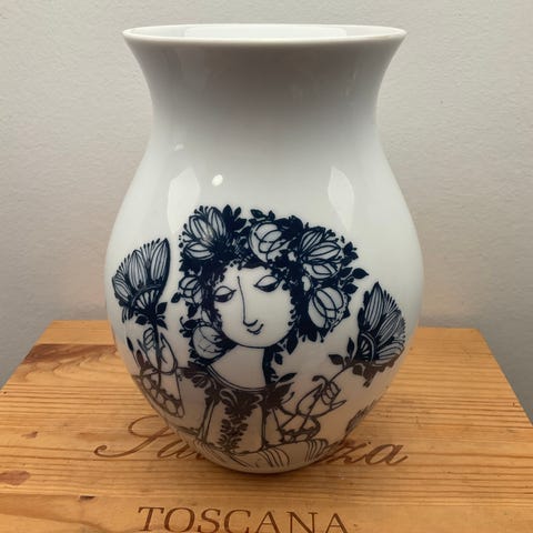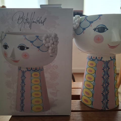Vase, Vase og lysestager, Bjørn Wiinblad, Vase (18 cm) samt to lysestager fra Bjørn Wiinblad, med mørk blå mønster.