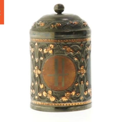 Den måler ca. 18,5 cm på den længste side, 12 cm på den korteste side og den er 8,5 cm høj.