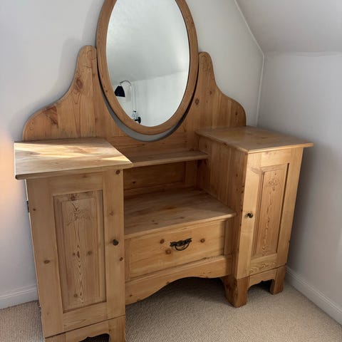 Toiletmøbel, b: 125 d: 50 h: 177, Fint gammelt møbel med ovale spejl, 2 skabe og 2 skuffer. Lager lukker lidt skævt, men kan sagtens låses med medfølgende nøgle.