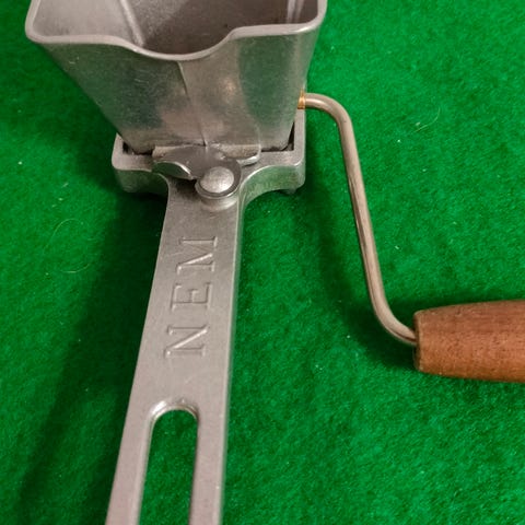 Fransk persillehakker, Peugeot France, Gammel fransk persillehakker. Med messingbeslag i teaktræsgrebene. Smuk i køkkenet. Bredde 20 cm.