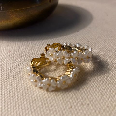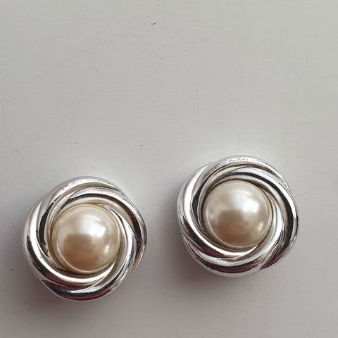 Et par rektangulære øreclips med klare similisten på guldfarvet baggrund, prydet med stiliseret mønt dekoration.