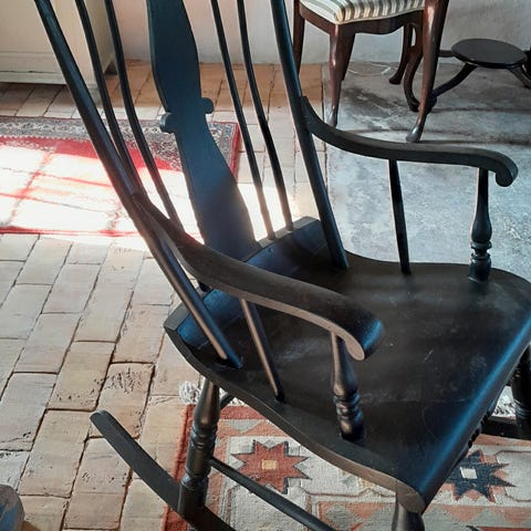 Gyngestol, stof, Vippestol med blåt nyligt ompolstret betræk.