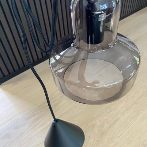 Anden loftslampe, kongeblå farve glas, 1 stk. flotte glas pendler i kongeblå farve med bølge kant , hvid ledning små fatning pære(følge ikke) str. 17 ½ cm. x 14½ cm. i diameter med lang ledning. (prøves ved afhentning) kan hentes for 60 kr.