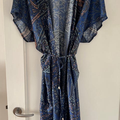 Kjær København mørkeblå tynd jakke eller kimono, der lukkes med bindebånd. Lommer i siden, der kan sprættes op. Størrelse S. 100% tencel. Style: Mandalsgade blazer. Helt ny, stadig med prisskilt. Nypris: 600kr