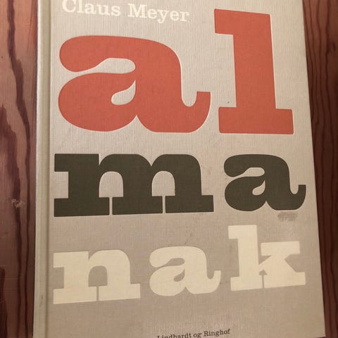 Almanak, Claus Meyer, emne: biologi og botanik, ALMANAK er Claus Meyers drøm om det fuldendte madår. Med udgangspunkt i årets gang og sæsonernes skiftende råvarer tilbyder bogen mere end 1.000 opskrifter på aftensmad, småretter og desserter, men også syltesager, pålæg, drikkelse, brød og kager. Det hele fordelt ud over samtlige af årets 365 dage.