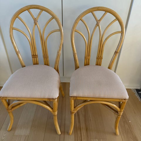 Fint sæt vintage stole i rattan og bambus. Ikke helt symmetriske. Små mangler. Faste og stabile med fødder i messing/jern. Samlet pris.