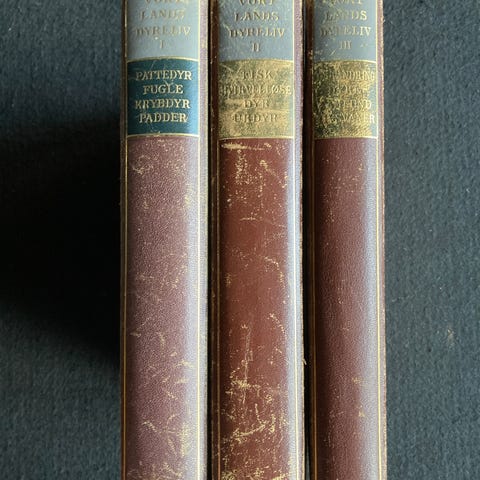 [Zoologi - Entomologi - Ornitologi - Natur og dyreliv]. Udarbejdet af Anton Fr. Bruun, J. O. Bøving-Petersen, P. Jespersen, I. Lieberkind, C. Wesenberg-Lund og E. Wesenberg-Lund. Bd. I: Lavere Dyr, Insekter. Bd. II: Fisk, Padder, Krybdyr og Fugle. Bd. III: Pattedyr. Rigt illustreret i s/h og med farveplancher.