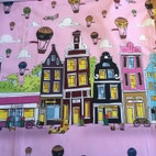 Stof, 150x160 cm jersey bomuldsjersey, lyserød med sjove huse og luftballoner. Husene er ca. 30 cm høje og borduren med huse er 3 gang på stoffet. Jeg sender med BRING og modtager Mobile Pay.