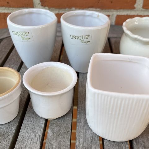 Nr. 5) Urtepotteskjuler m/tud og hank, hvid metal, H 11 cm Diameter 12,5 cm B total 28 cm, kan ikke bruges som vandkande, brugt men pæn, Pris 15 kr.