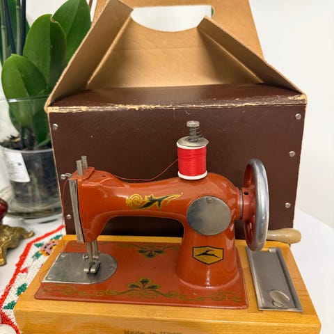 Retro børne legetøjs symaskine som ikke ikke er lavet til at sy rigtigt, den går bare op og ned som om den syr når man drejer på håndtaget