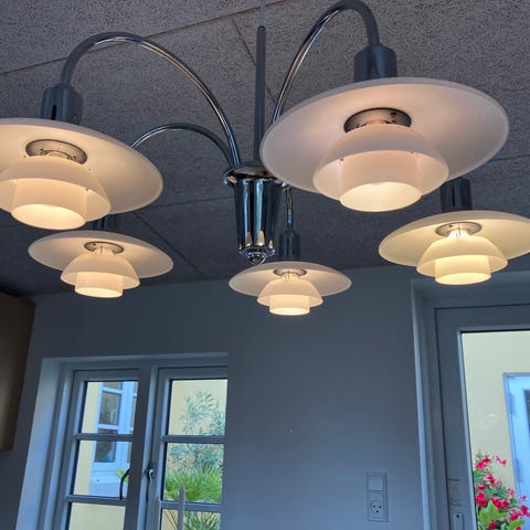 PH Bombardementslysekrone, Louis Poulsen, år 1999, 1999 udgave, Bombardementskrone. Design af Poul Henningsen, produceret hos Louis Poulsen. Jubilæumsmodel fra 1999 i forkromet metal m. 2/1 opalglasskærme. Flot stand. Der medfølger naturligvis det originale certifikat med/ Perfekt Stand, ingen skår eller brugsspor, Kan Evt. Leveres NY Pris 35-36.000 Kr.