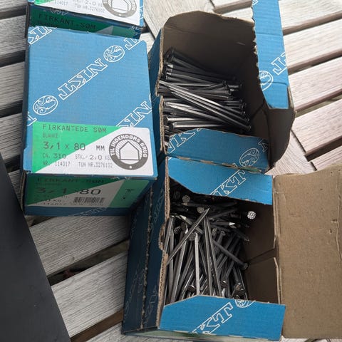 Søm og skruer. En halv kasse eller mere i hver. Samlet 75kr